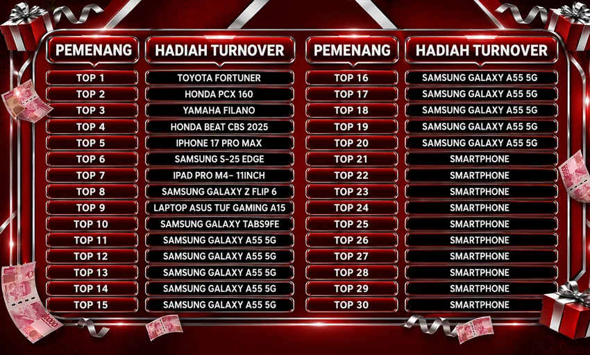 - Peringkat dihitung berdasarkan akumulasi TURNOVER SLOT di periode bulan sebelumnya dan perhitungan TurnOver dimulai dari tanggal 1 pada pukul 00:00 WIB dan berakhir pada pukul 23:59 di Akhir Bulan